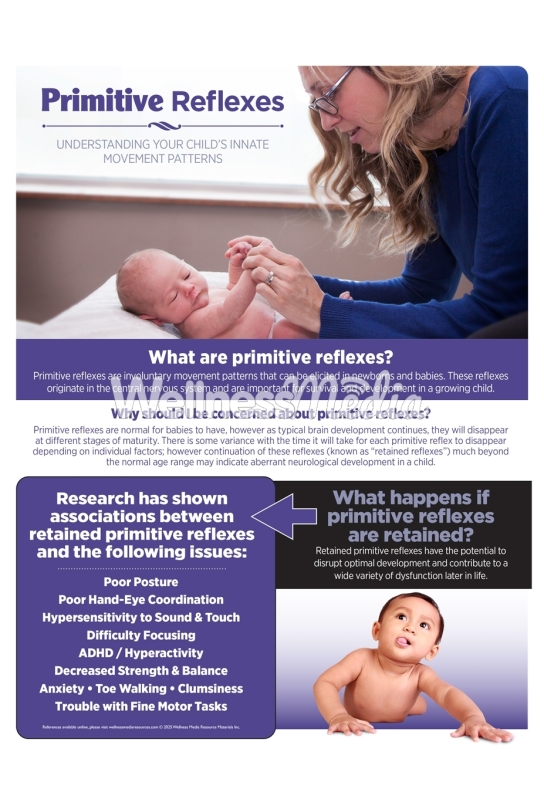 This double sided handout provides an introduction to primitive reflexes, explaining the importance and purpose of these reflexes, as well as the impact retained primitive reflexes can have on a growing child if not addressed early in life. Some examples are included, demonstrating how to test for the specific reflex and the recommended strategy used to encourage reflex integration.
